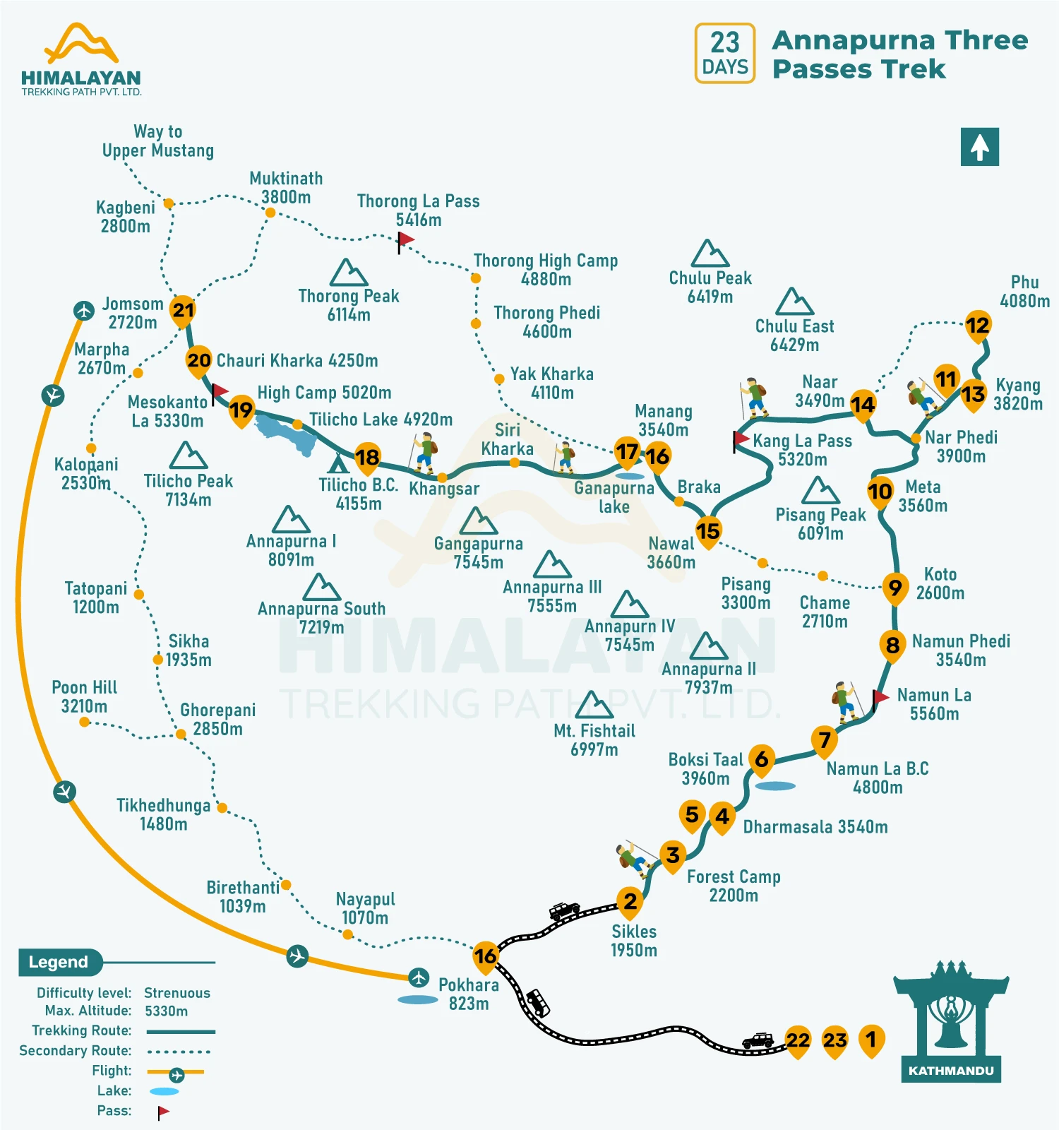 The Annapurna Three Pass Trek is a demanding and secluded trekking route located within the Annapurna Conservation Area. This expedition highlights the unspoiled beauty of the natural environment and the cultural variety encountered along the journey. It offers an excellent chance to experience the breathtaking landscapes, rich biodiversity, cultural richness, pristine beauty, glaciers, lakes, and stunning mountain views of the Annapurna, Dhaulagiri, and Manaslu ranges. The Three Pass Trek is a recently established trekking route that features the Namun La at 4850m/15912 ft, Kang La at 5,306m/17,408ft, and Mesokanto La at 5,330m/17,486ft. These passes are among the most remarkable trekking paths in the Annapurna region. If you are seeking a three-week adventure on an off-the-beaten-path trek in Nepal, the Three Pass Trek is ideal for you. Reserve the Three Pass Annapurna Trek with the local expert team at Himalayan Trekking Path Pvt. Ltd for the best offers, exceptional hospitality, outstanding service, all at an affordable price.